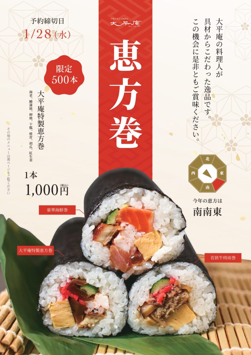 今年も「大平庵」運営グループ O3dining より、毎年ご好評の恵方巻きを販売いたします!